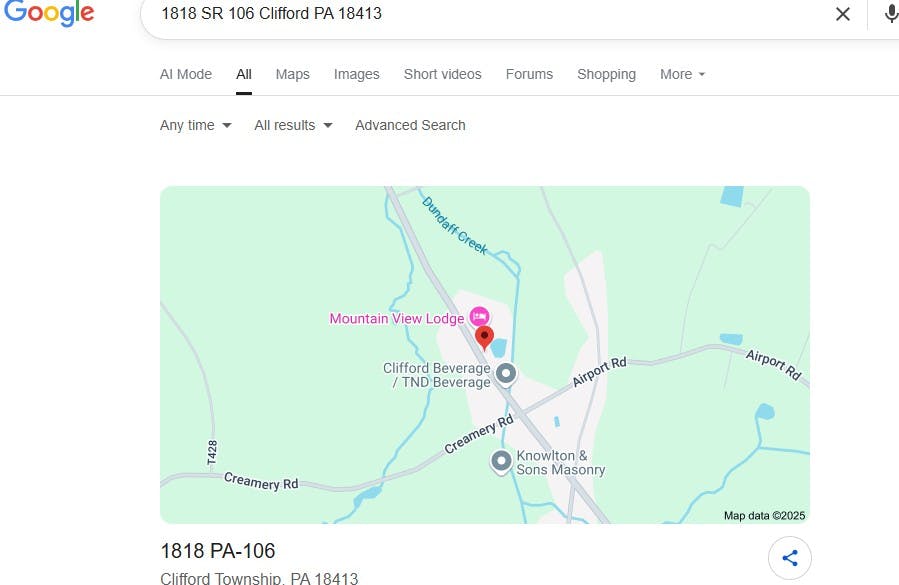 Exit 206 of Interstate 81. Route 374 EAST 3 miles to PA Route 106. Make right onto PA Route 106 approximately 1 mile on the left.